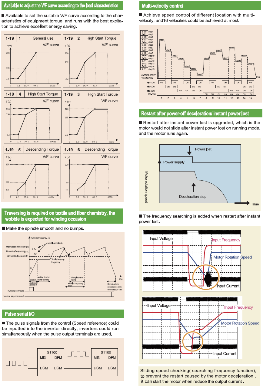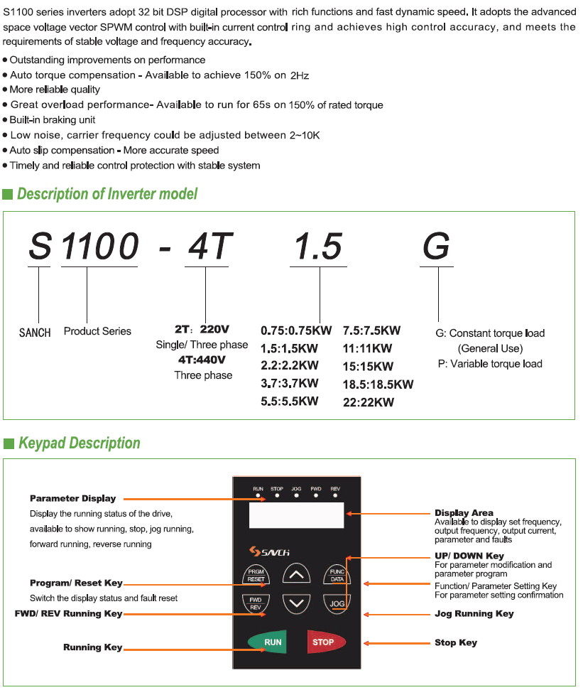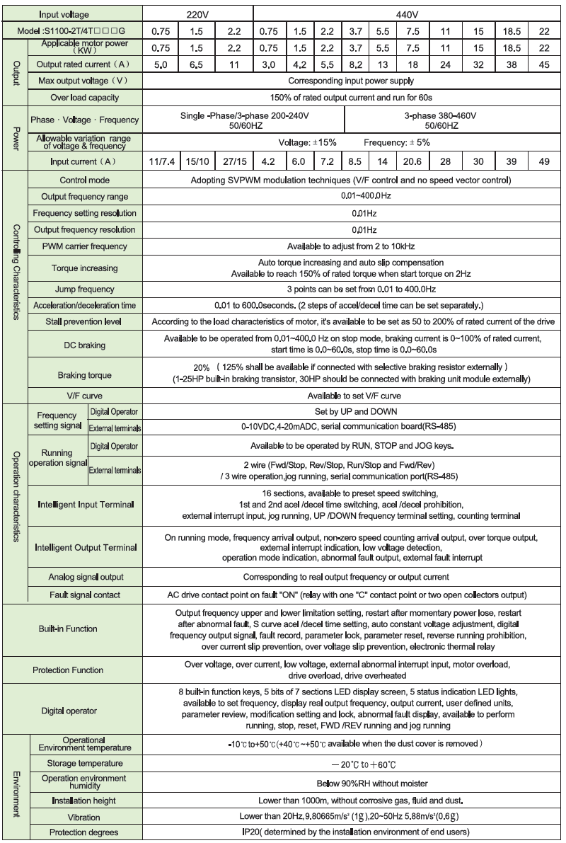 S1100 V/f general purpose Rated Voltage: 220V single phase/ 220V 3phase/ 440V 3phase Power: 0.75kW~22kW Output frequency: 0.01Hz~400Hz