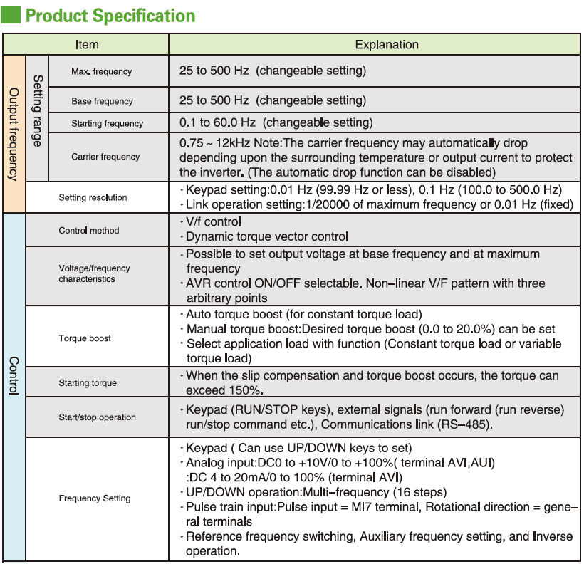 Output frequency:0.1Hz~500Hz