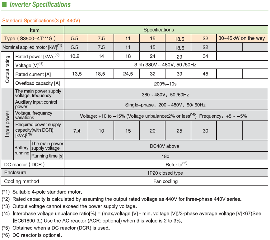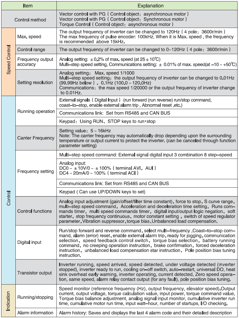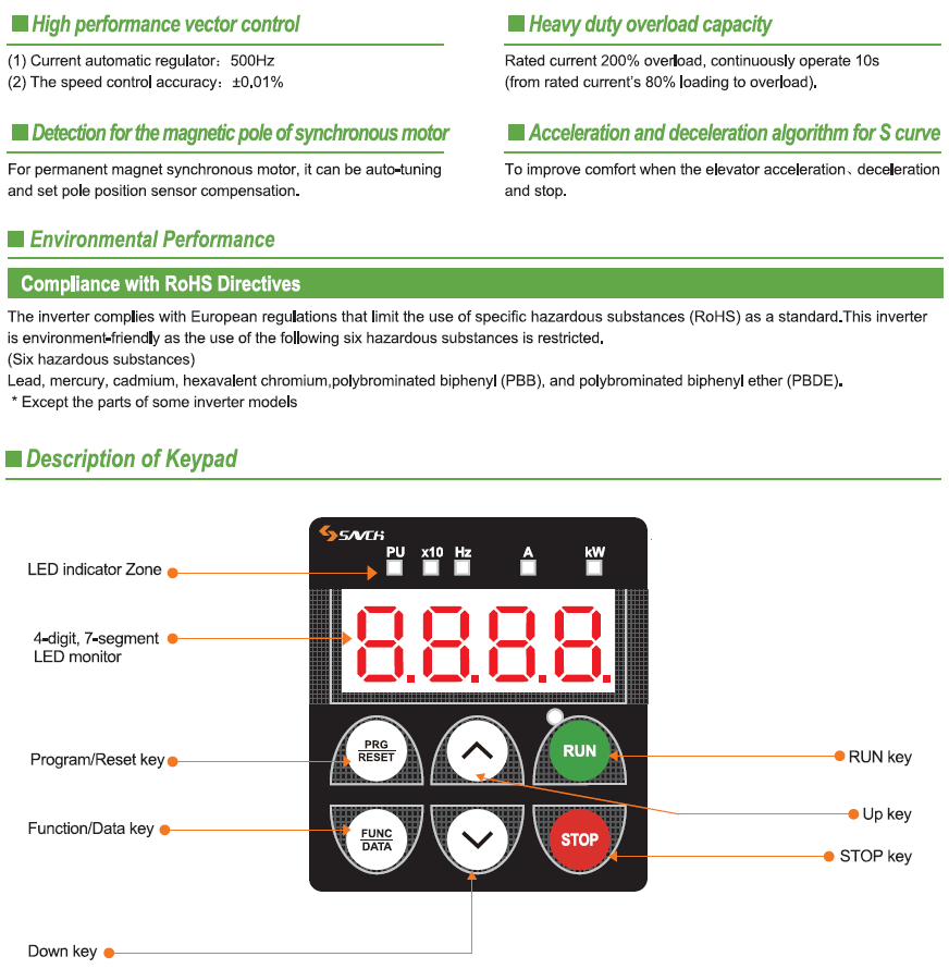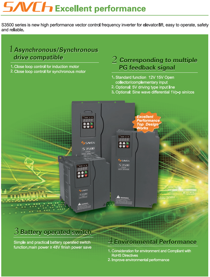 S3500 Elevator/lift specialized Rated Voltage:440V 3phase Power:5.5kW ~45kW Output frequency:0.1 Hz ~120 Hz